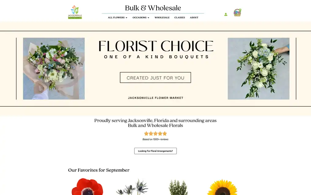 An elegant e-commerce site for a local flower shop, designed to highlight their beautiful arrangements and simplify the online ordering process. The website effectively brings their fresh blooms to customers across Jacksonville.