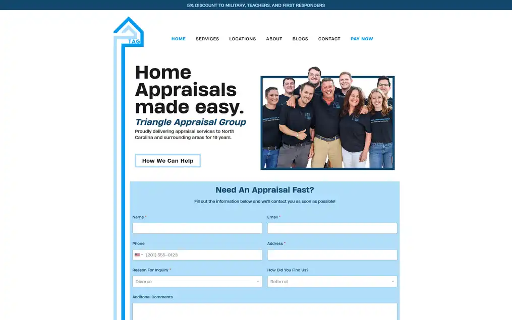 Clean and professional website for Triangle Appraisal Group, a leading real estate appraisal firm. The site was designed to clearly articulate their comprehensive property valuation services, build trust with potential clients, and streamline the process for obtaining quotes and booking appraisals.