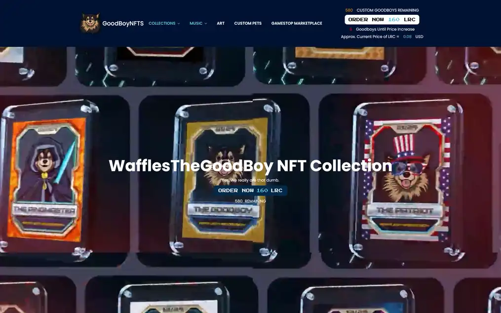 Whimsical and engaging website for “Waffles the Good Boy NFTs,” a character-driven digital collectible project. The site was crafted to introduce the unique lore, showcase the digital assets, and foster a vibrant community, all while clearly outlining the roadmap for this playful NFT series.