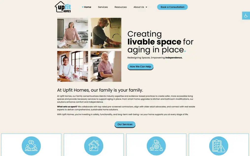 Professional website for “UpFit Homes”. A Family owned business blending industry expertise and evidence-based practices to create safer, more accessible living spaces and provide necessary services to support aging in place.